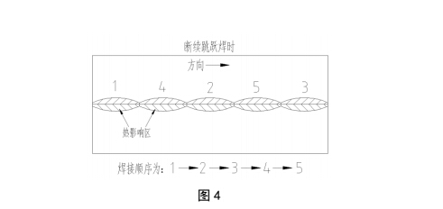 解決方法是采用合理的焊接工藝。我們建議采用“斷續跳躍法”,即將需要焊接的區域分為多段(當然這些分段的數量可以依據工藝試驗后,進行確定),如圖 4所示。