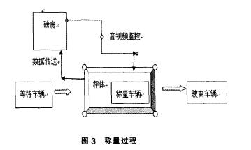 地磅計量系統安裝在酒鋼的可回收資源利 用場地內,衡器最大可承重200t,安裝在距值班室 東側50m處項目的稱量軟件上實時顯示數據。通過 視頻監控,音頻視頻實時傳輸技術對計量過程全程 監督利用網絡技術實現了計量稱重數據自動上傳。 當載重汽車稱量時首先告知磅房值班員,并取得相 關票據,安裝在現場值班室前端的攝像機及安裝在 秤體兩端的紅外光電傳感器開始工作,此時值班員 需觀察視頻監控主機和磅房稱量系統界面,當載重 汽車確實完全進人衡器且前后紅外報警裝置均不 被遮擋,待衡器達到穩定狀態后,即計量數據不隨 車輛慣性發生浮動后數據自動存人磅房稱重系統。 當車輛處于非正常位置時,值班員可在磅房內通過 圖像和光電傳感器進行識別,用話筒和設在現場的 揚聲器提醒駕駛員及時調整車輛位置,直到數據自 動上傳為止。稱重過程如圖3所示。
